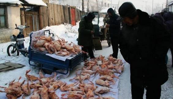 瞅瞅这肉色纯正的鸡,就保存在冷风中,绝对新鲜!