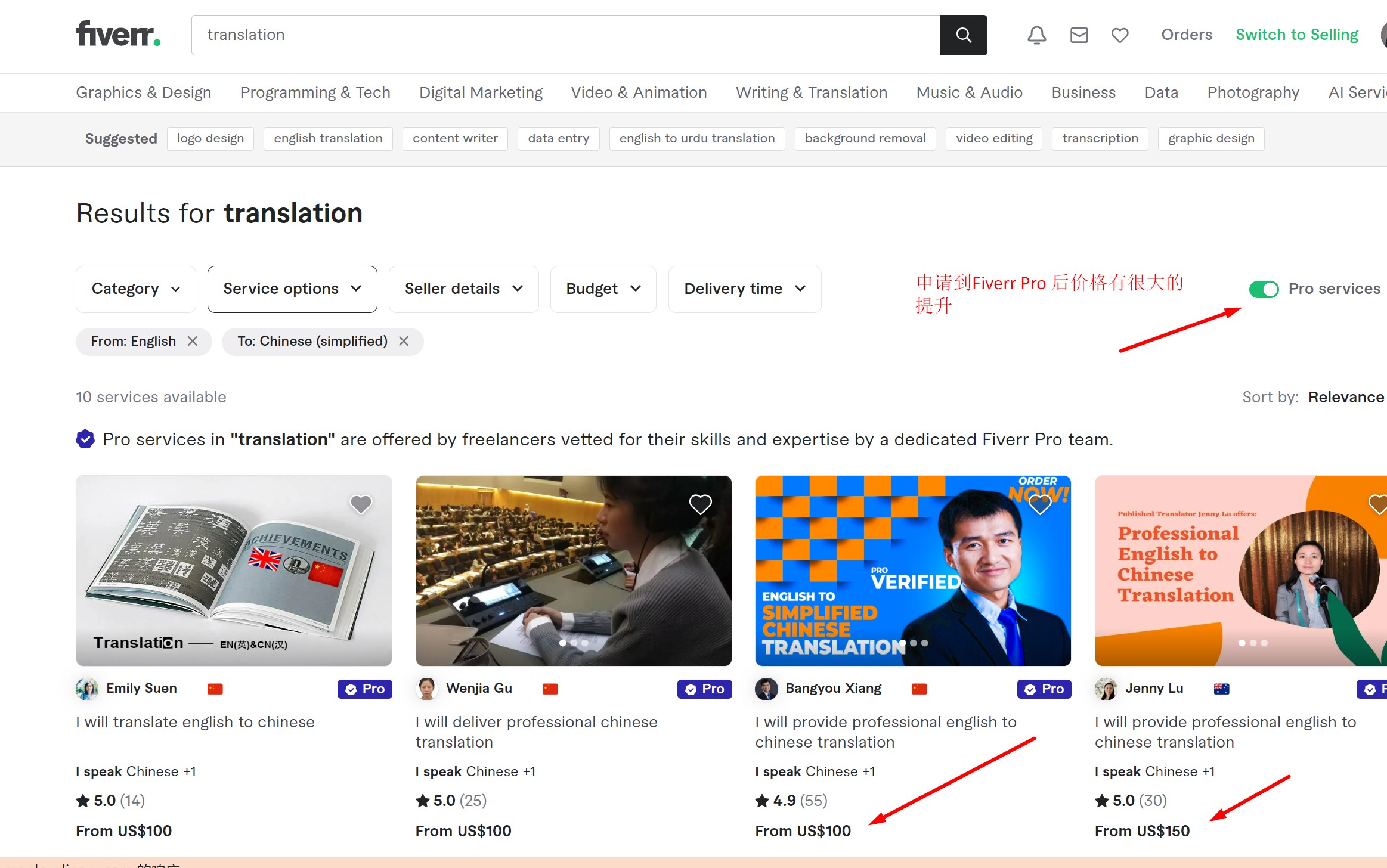 由于全球各地的自由职业者都汇聚在这里,所以在Fiverr干活,英文翻译并不是一件轻松的事。除了顺利完成任务,你还要面对激烈的竞争。当然,你也可以申请加入FiverrPro,通过审核后,你的价码可以从5美元涨到100美元。不过对于大多数小伙伴来说,Fiverr的门槛有点高,而且也很卷
