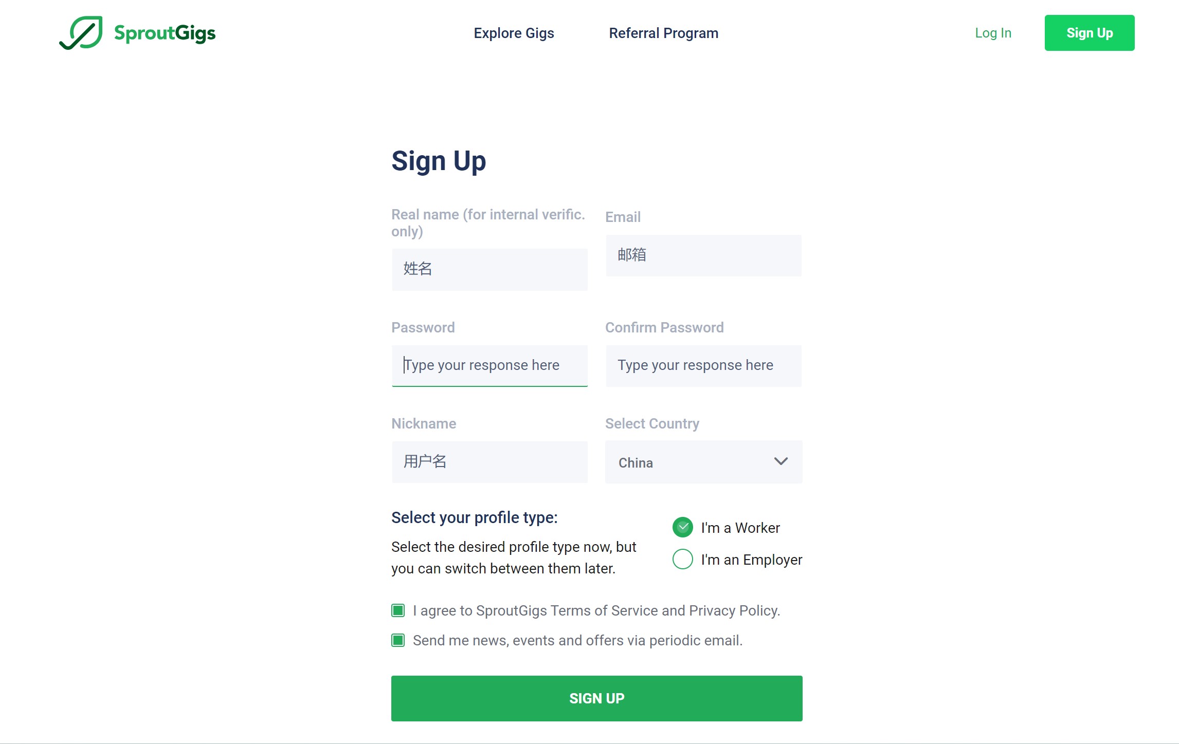 废话不多说,我们现在就开始吧。首先是注册一个账号。这个平台对全球开放,无论你在哪个角落,都有机会成为会员。填写姓名、电子邮箱、密码、用户名,选择国家,勾选同意相关条款,别忘了要勾选I’m worker,然后就搞定注册。别忘了进邮箱点击确认链接,然后进入工作区。