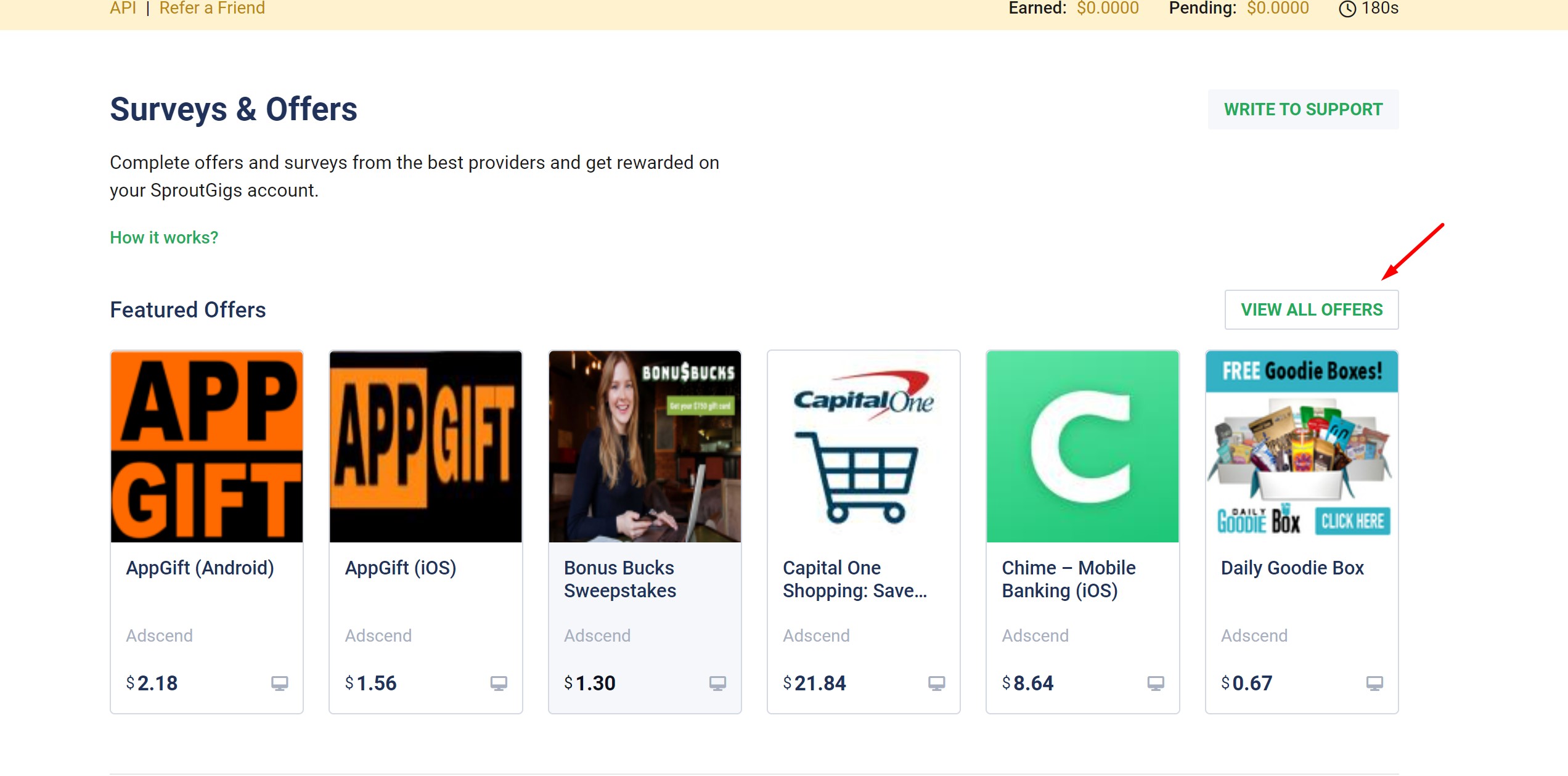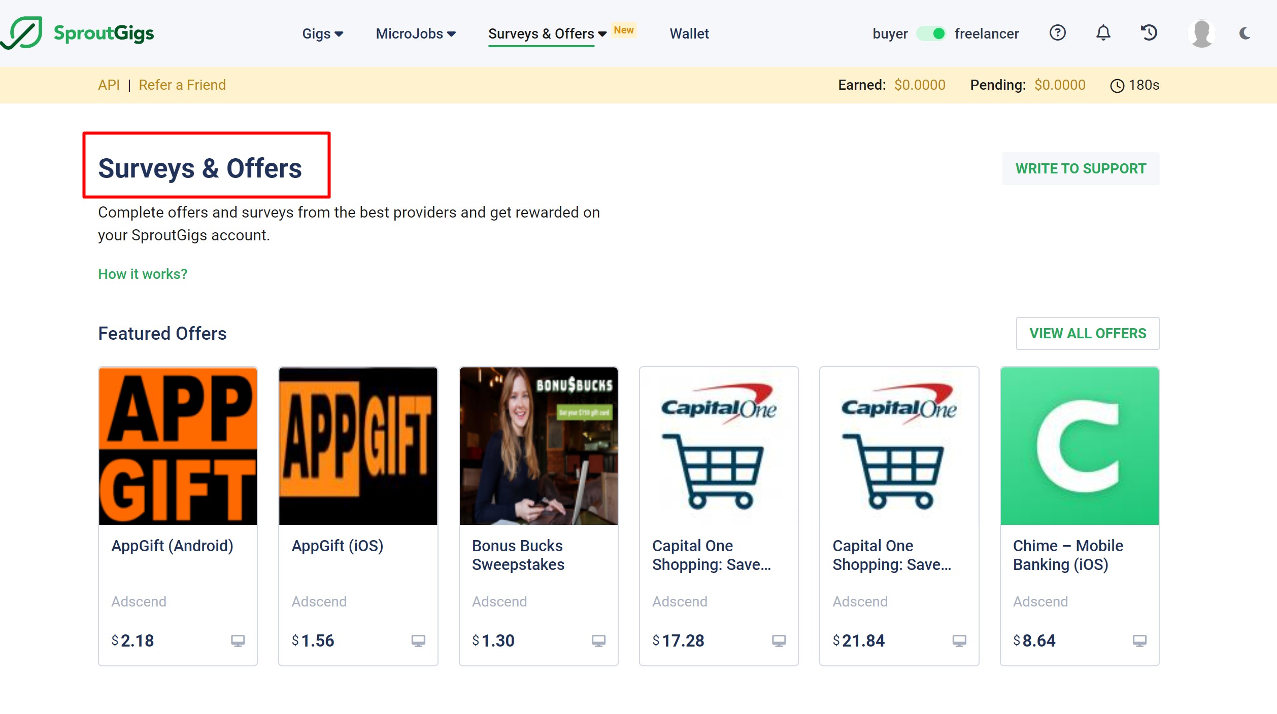 除了Micro job和Surveys,我们还有更多的选择。点击View All Offers,我们可以看到,这里还有很多任务可以领取。这个板块的最高单价可以达到100+美元以上,但是要求也是比较高的。
