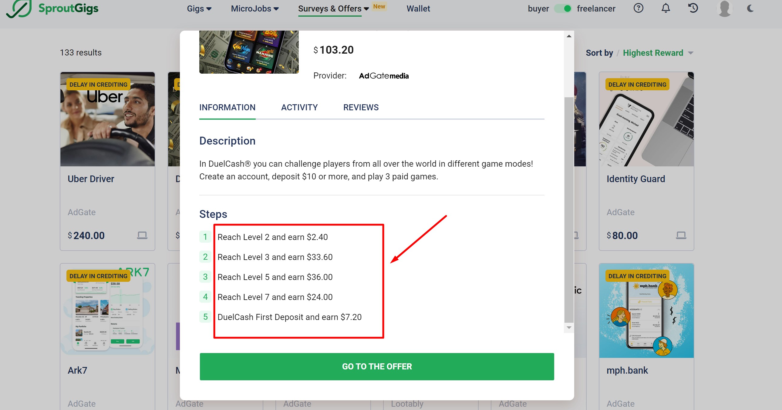 打开其中一个任务吧。这个任务要求你下载一个APP,完成后最高可得100+美元的奖励。这个游戏每升一个级都有奖金,比如账号等级到7级就能拿到24美元,真的很诱人!
