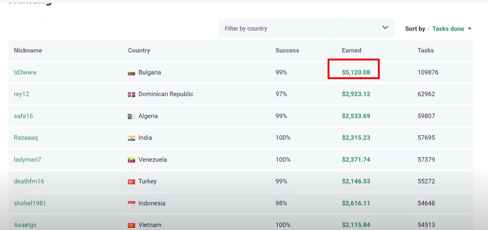 那么,从这个平台上我们能挣多少收益呢?统计数据显示,这里来自世界各地的自由职业者的第一名已经挣到了5,000美元以上,还有不少用户收益都在1,000美元以上。如果你有足够精力就可以赚更多的美金。