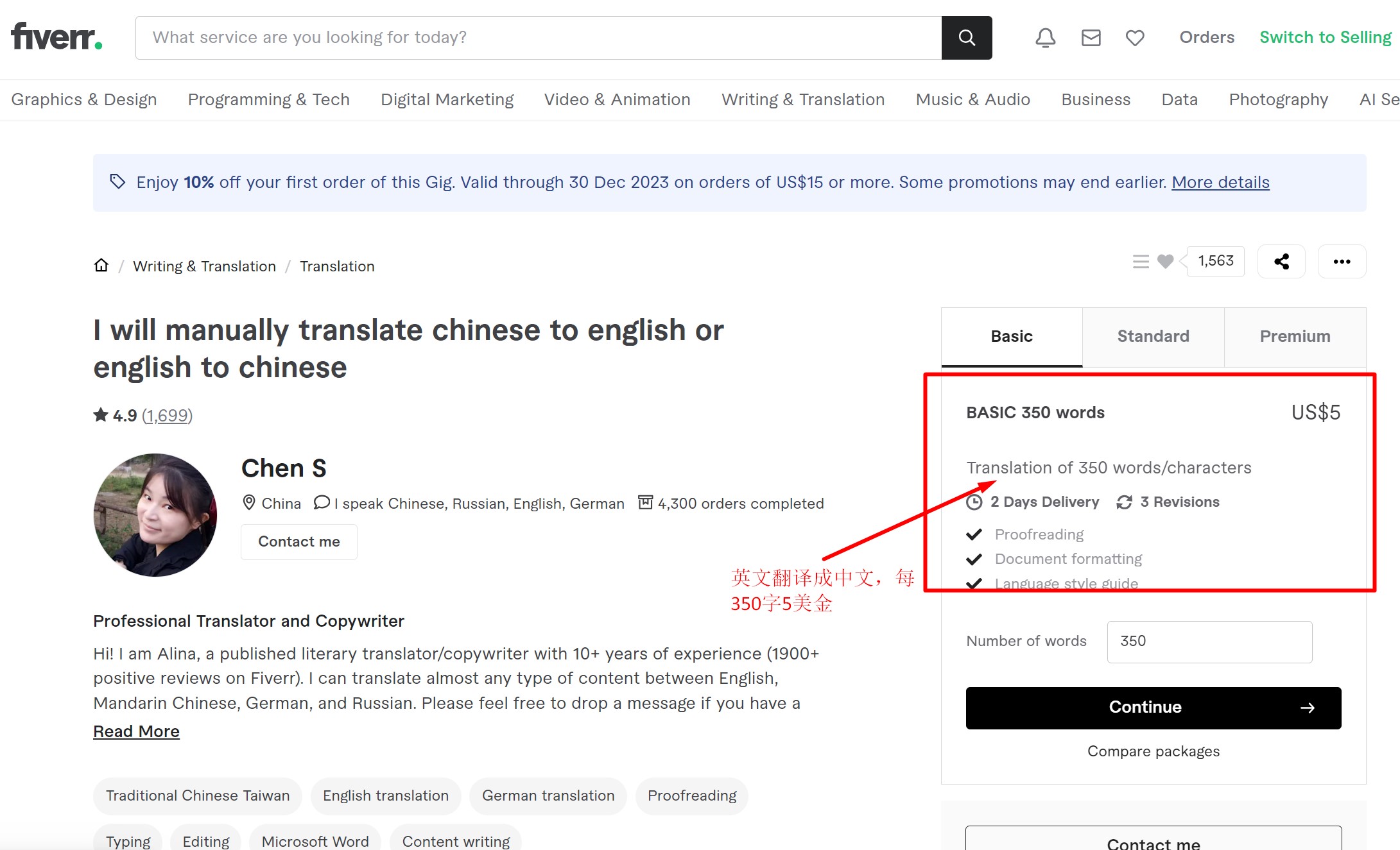 无论你擅长图形设计、网站建设、英文写作还是翻译,都能在这里找到不错的赚钱机会。比如,如果你是英语专业的大学生,可以直接在Fiverr挣钱。一般来说,翻译350个英文单词到中文就能得到5美元。如果你能完整翻译一篇文章,收入可能就上几十美元甚至更多。
