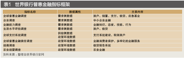 全球层面的普惠金融指标监测体系和政策主要由国际组织研究设计。本文选取世界银行和G20 发布的相关资料予以例示。