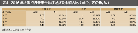 二是提升网点覆盖率。大型商业银行近年来均加强了在县域和农村地区的网点建设,扩大了金融服务的覆盖范围。在网点布局的方式上,除传统的设立分支机构之外,金融服务点和村镇银行逐步大规模在农村地区兴起。例如,农行在2016年年底建成“金穗惠农通”服务点63万个,中国银行旗下的中银富登村镇银行已成为全国最大的村镇银行集团。小微企业专营机构的设立也初见成效,其中工商银行下属小微金融业务中心最多,2016 年年末已达198 个。