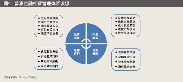 按照银监会“条线化”管理体制和银监会“五专”经营机制要求,建议各商业银行由总行层面统筹考虑各地区小微企业融资、三农金融服务、扶贫金融等类别普惠金融发展的需求和特点,从四个方面着手构建科学合理的经营管理体系:一是健全政策制度建设,明确具体方向,确保符合发展战略和自身优势,覆盖对所有业务的管理,并能得到有效的贯彻执行;二是完善产品服务,转变传统服务理念,重点以金融科技为驱动,探索定制化的业务模式,以成本收益匹配为前提,实现商业的可持续;三是搭建完整的内部管理架构,优化普惠金融业务流程,重视全面风险管理,操作依法合规,并视具体情况对分支机构进行差异化转授权;四是建立单独的考核评价机制,在满足监管考核的基础上,强化激励导向,对各区域不同分支机构进行差异化对待(见图4)。