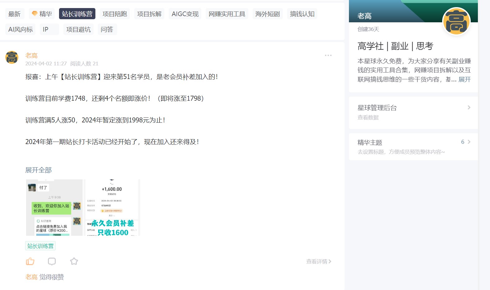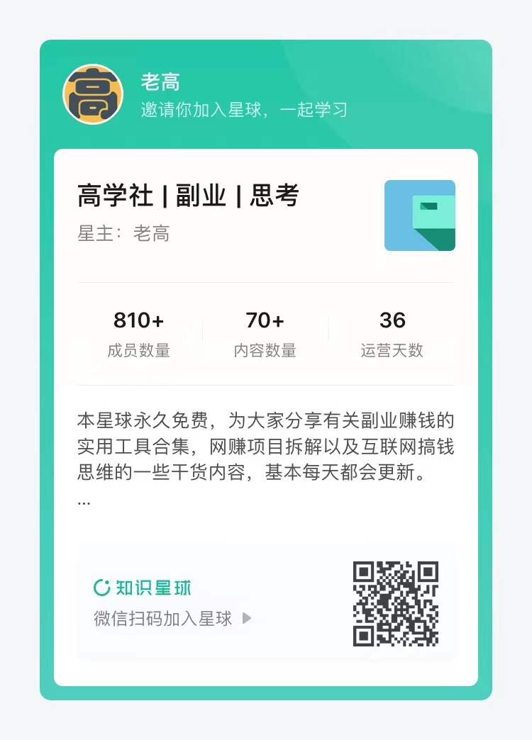 在年前,老高加入了老秦IP合伙人团队,在他的建议下,老高计划开启一个付费知识星球,并且配套一个陪伴群,定期自己分享或者邀请大佬嘉宾为大家分享市面上绝对能落地的网赚项目。这里再次介绍下老秦,老秦是一个靠副业就积累了7位数,拥有公众号20W粉丝的大佬,绝对的流量大拿,不仅能给到自己的合伙人带来实实在在的流量赋能,并且合伙人团队有测试自己的核心项目,目前已经有3个落地了,计划今年团队会出10个核心项目,欢迎大家找老高咨询并加入老秦合伙人团队,这里强调下:通过老高加入老秦团队的,自动成为老高的5年IP合伙人,我会和老秦一起给你流量赋能,一起打造自己的核心项目,一起赚取我们的7位数、甚至是8位数!