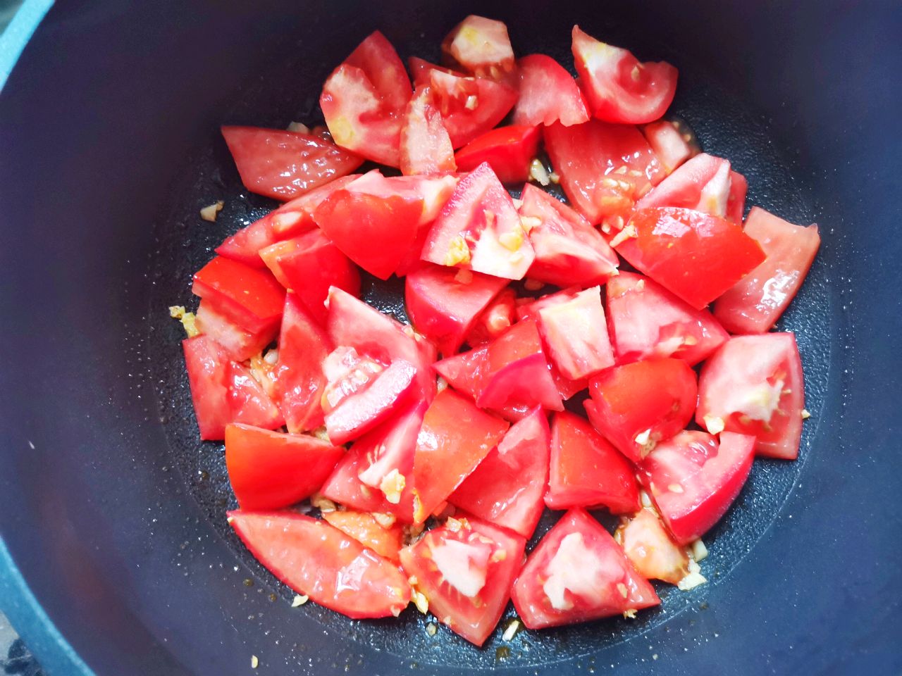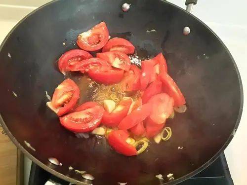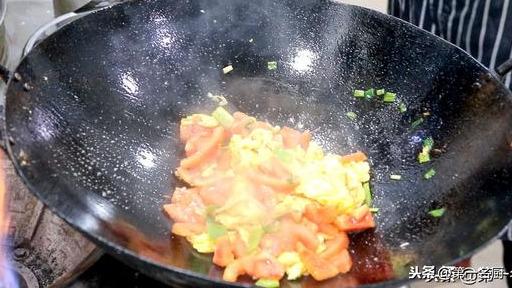 锅内再添入少许食用油,先倒入葱花爆香,再倒入西红柿,快速翻炒30秒钟左右,炒出西红柿里面的汁水,倒入炒好的鸡蛋,再翻炒几下,起锅撤火开始调味。