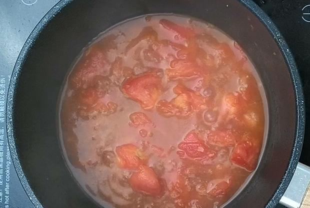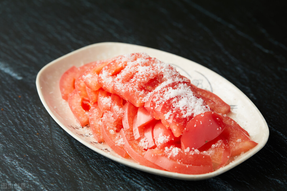 然后把去皮的西红柿切成薄片,放入盆中。其实西红柿去皮这个问题,有很多人都不在意,随着现在环境的恶化,食材在生长的过程中,不可避免的会造成一定的污染,自己吃还是建议去皮,口感也会更好。