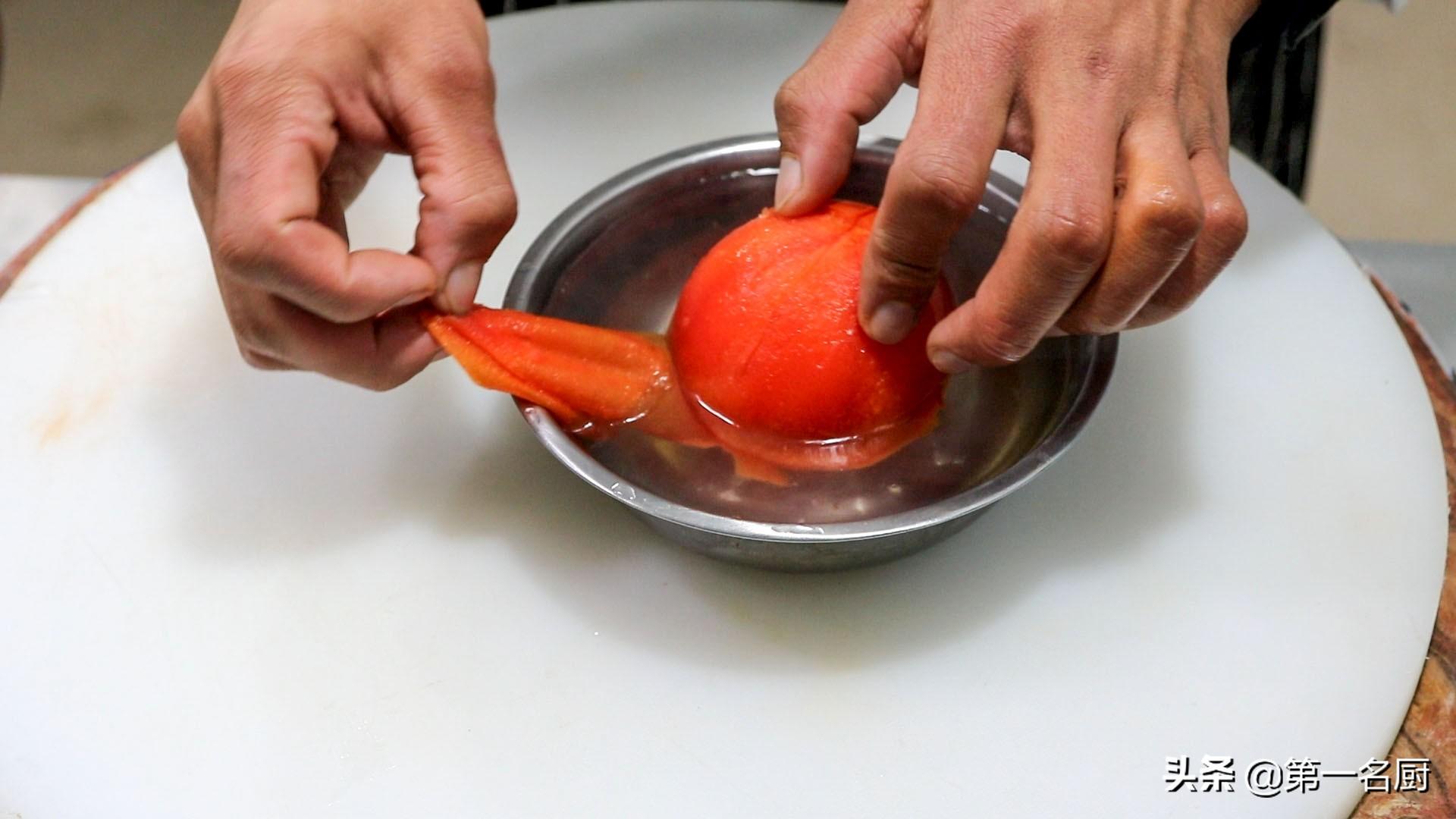 准备一个西红柿,在顶部打上十字花刀,用开水烫一分钟,揭去西红柿外皮备用。