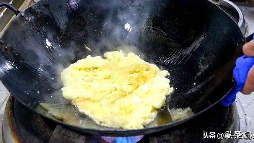 炒锅烧热,添入半勺食用油,倒入鸡蛋液,用勺子搅动,颠锅翻炒,把鸡蛋炒熟以后,倒出控油。