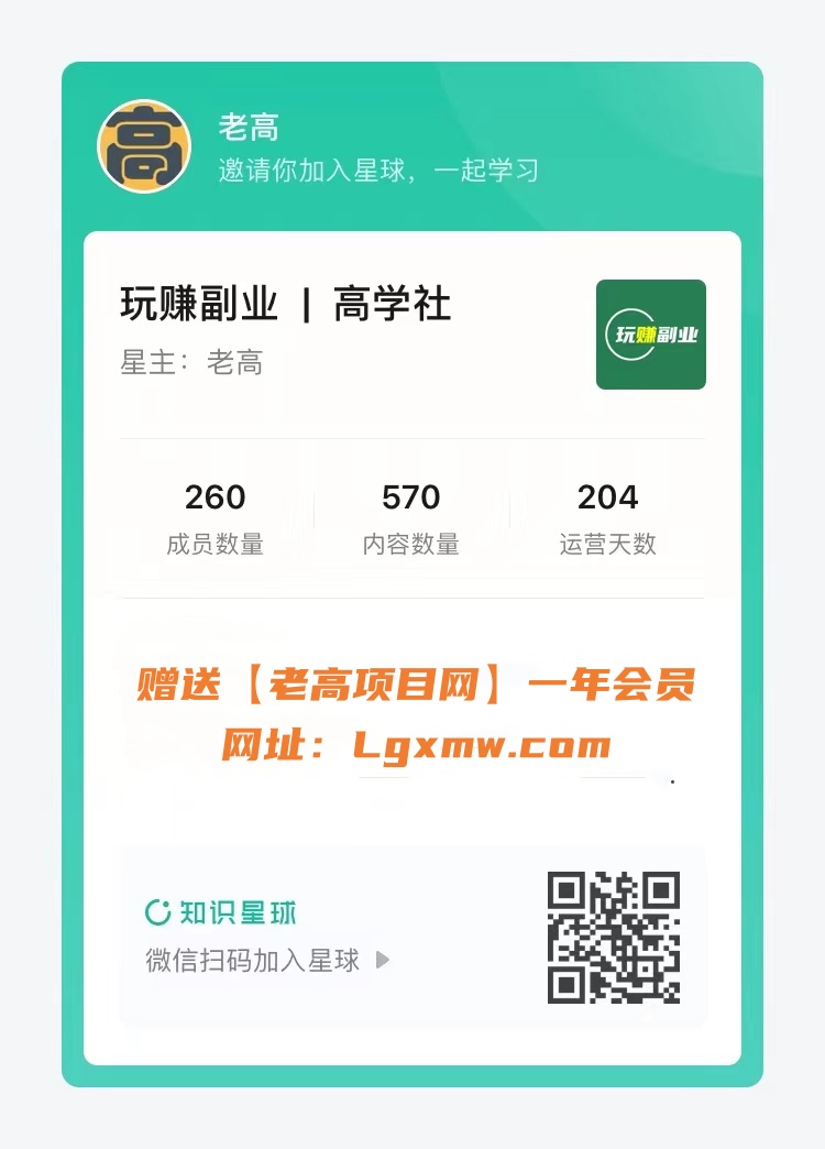 ✅【玩赚副业】社群(直接扫二维码即可加入),加入后找老高兑换福利,赠送你【老高项目网】一年会员,网址:Lgxmw.com