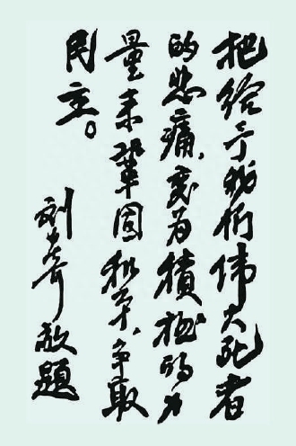 释文:把给予我们伟大死者的悲痛,变为积极的力量来巩固和平,争取民主。刘少奇敬题。