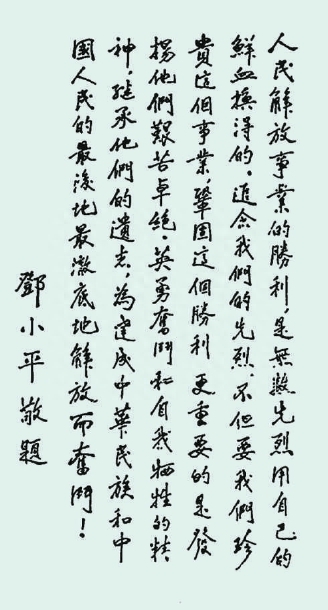 释文:人民解放事业的胜利,是无数先烈用自己的鲜血换得的。追念我们的先烈,不但要我们珍贵这个事业,巩固这个胜利,更重要的是发扬他们艰苦卓绝、英勇奋斗和自我牺牲的精神,继承他们的遗志,为达成中华民族和中