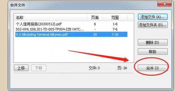 接着点击合并文件弹窗中的添加文件选择需要合并的PDF文件,可以通过“上移”/“下移”调整PDF列表中的顺序,此时的顺序即为合并后的PDF页面顺序,设置完成后点击右侧面板中的“合并”即可。