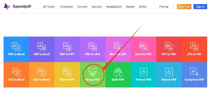 这个方法不仅免费,而且手机和电脑通用。首先搜索speedpdf,点击并进入这个工具首页。不用注册和登录,直接选择页面推荐转换格式中的Merge PDF(合并PDF);