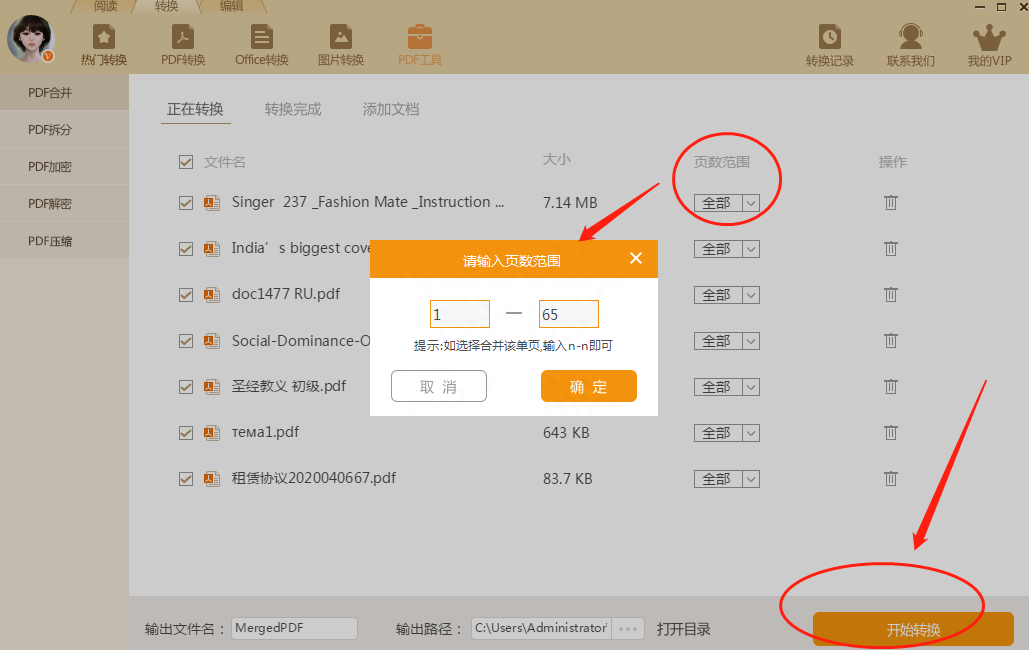 点击“添加文档”并选中所有需要合并的PDF文档上传,上传后通过“页面范围”可以设置每个文档需要合并的页面范围;全部设置完成后点击右下角的“开始转换”修改pdf默认打开方式,转换成功后下面会有提示,点击“查看”即可;