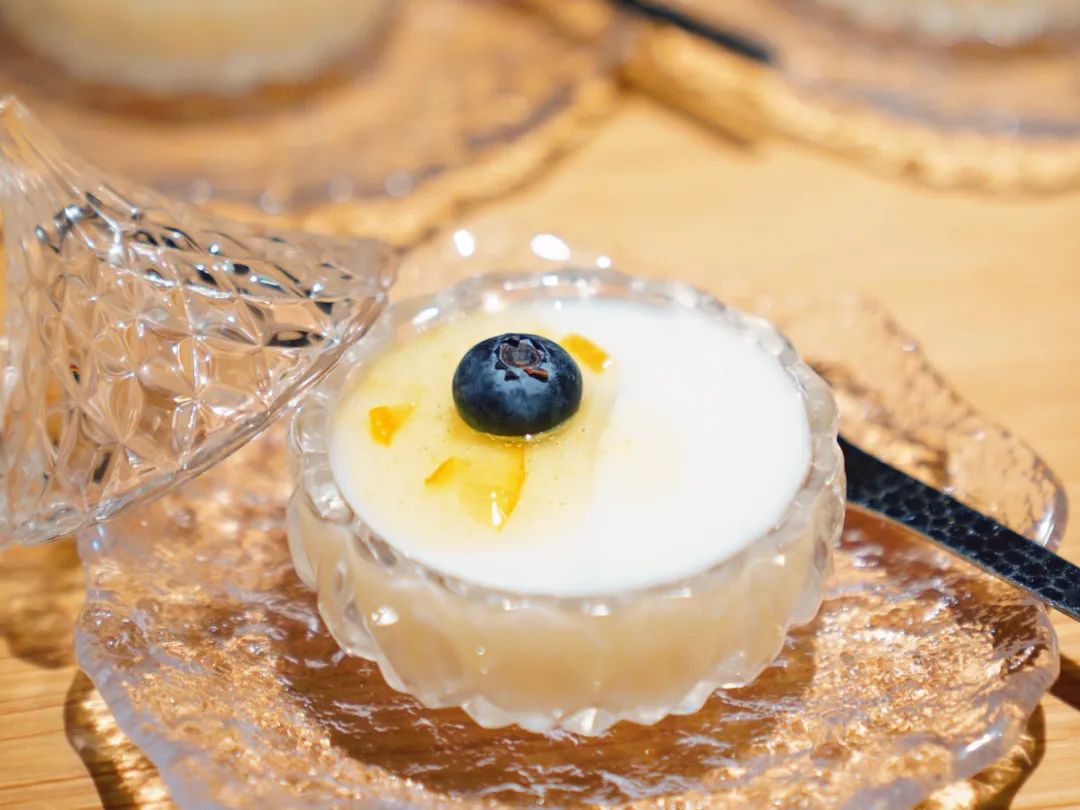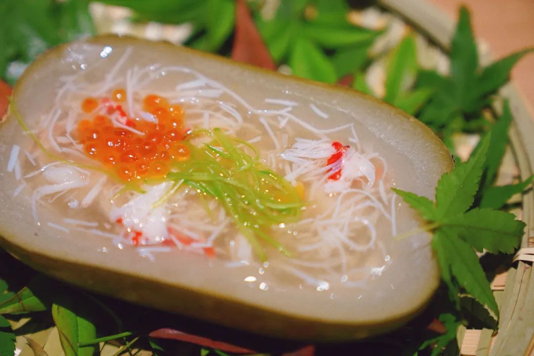 蟹羹配百合,冬瓜盅打底,加上百合丸子 ,口感细腻,黏稠滑溜,有趣食感,不同食材组合巧妙,“清新”与“鲜美”搭配,口舌愉悦的同时,还滋养了心神。