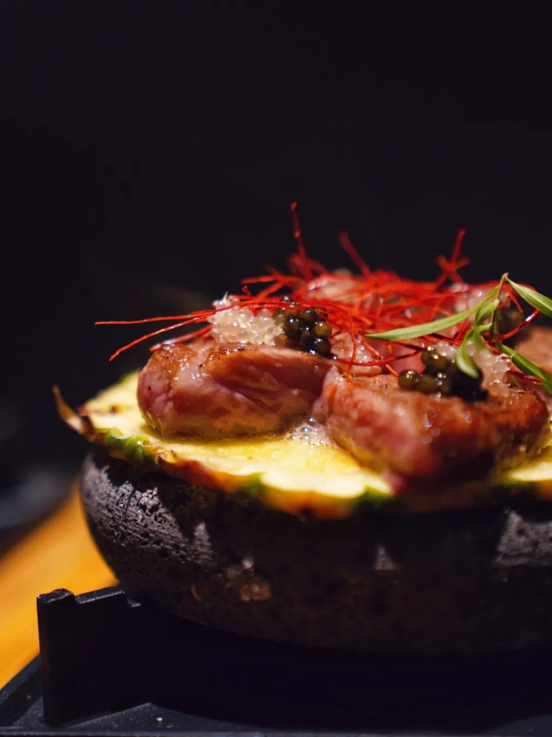 采用新鲜的菠萝打底,降低了雪花的肥厚油脂感,点缀的鱼子酱和手指柠檬又是“清新”与“鲜美”的碰撞,这种较量暧昧而诱惑,表面水火不容,实际暗流涌动,相互成全。