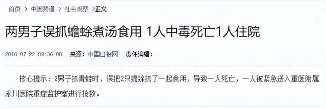 根据中国日报网的报道,2016年7月19日,两名男子抓青蛙时,误把2只蟾蜍抓了一起食用,最终导致一人死亡,一人被紧急送入ICU。