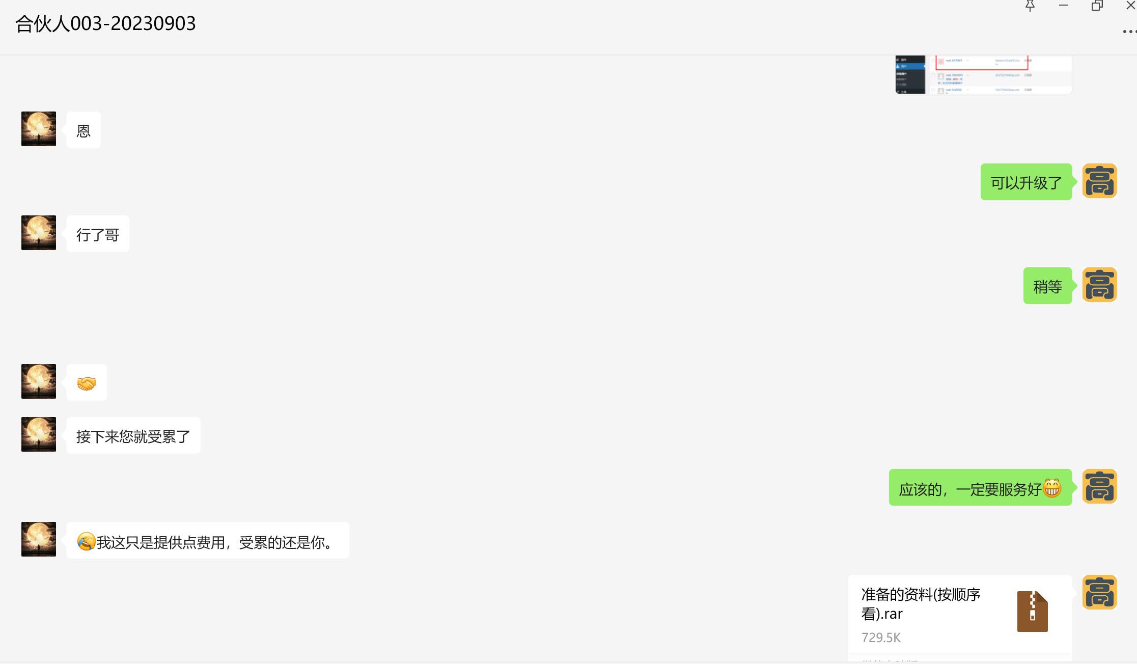 今天是2023年9月3日,《老高项目网》正式运营历经45天,迎来了第3位合伙人!这位老弟之前是老高的永久会员,当时会员开通后加微信和这位老弟聊了不少,发现以前还是同行,对老高的合伙人项目很有想法,只是今天才有时间做了一个升级,感谢这位合伙人对老高的信任,这里先祝贺他未来能大麦!