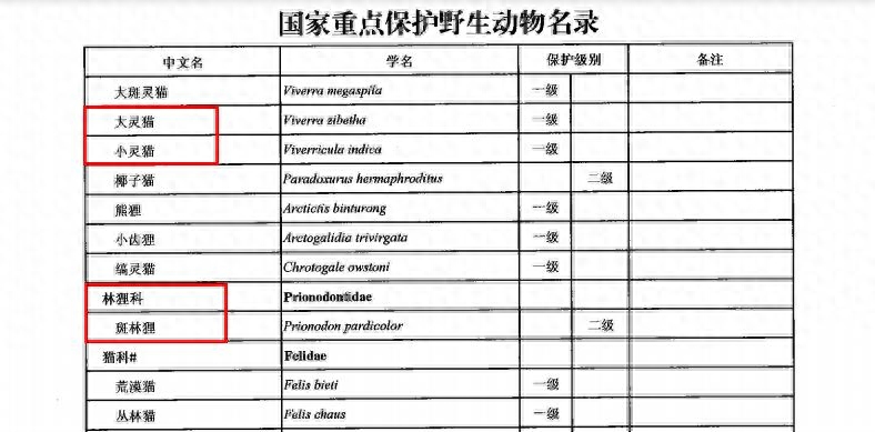 在很多文章里面,由于作者对斑林狸及灵猫类动物了解不全面,通常是一知半解,就会将斑林狸等同于小灵猫啮齿类动物,事实上这是两种不同的动物,这点我们看《国家重点保护野生动物名录》就知道了。