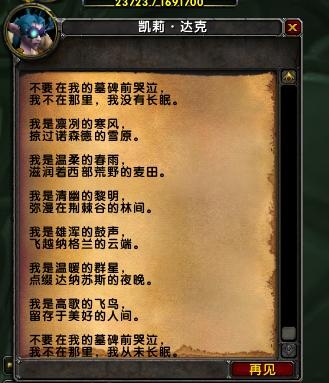 不要在我的墓碑前哭泣,我不在那里,我没有长眠。我是凛冽的寒风,掠过诺森德的雪原。我是温柔的春雨魔兽世界故事,滋润着西部荒野的麦田。我是清幽的黎明,弥漫在荆棘谷的林间。我是雄浑的鼓声,飞越纳格兰的云端。我是温暖的群星,点缀达纳苏斯的夜晚。我是高歌的飞鸟,留存于美好的人间。不要在我的墓碑前哭泣,我不在那里,我从未长眠。