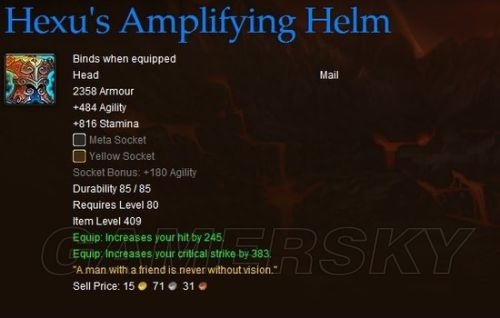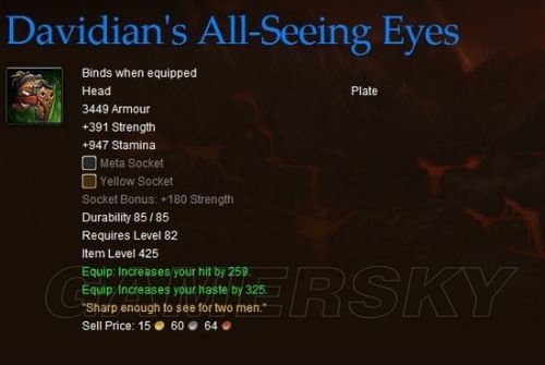 暴雪专门为增强萨满Hexu和死亡骑士Davidian设计了两件头盔,锁甲“Hexu的增强之盔”和板甲“Davidian的全视之眼”,在装备的说明中分别写着“以友为眼者永不失明”和“敏锐到足以为两人同视”。