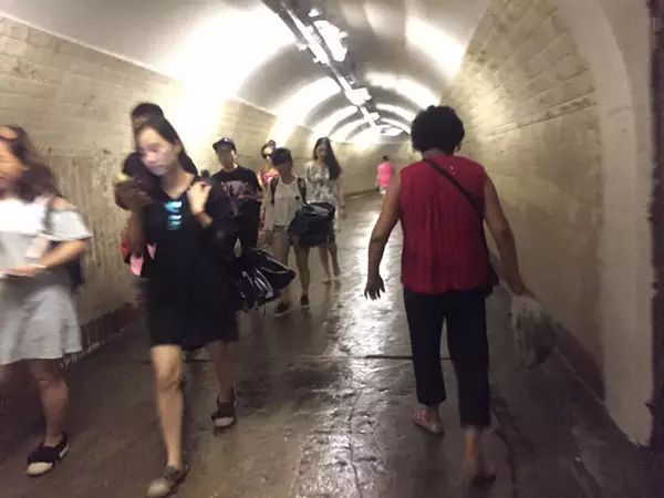 清早买完菜的老人穿过笔山洞回家,与一批游客擦肩而过。