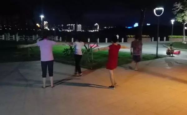 夜晚,鼓浪屿岛上的居民在游客稀少的内厝澳码头附近跳广场舞。