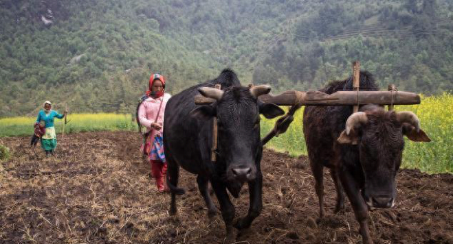 农业工具:尼泊尔的农民使用简单的工具,如犁、铲子、镰刀、锤子、斧头和凿子进行耕作。牛用来耕田。他们不使用任何机械工具。他们手工完成所有工作,并背负农场负荷。
