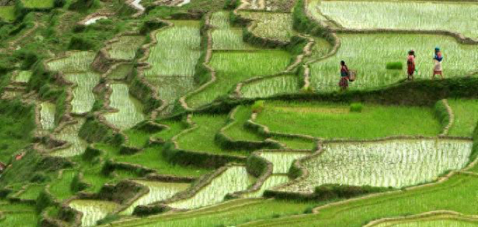 农田:大多数尼泊尔人生活在山区非常陡峭的山区。因为在尼泊尔下雨很多,当土地没有被植被覆盖时,农田的珍贵土壤很容易被冲刷掉。于是农民们把山丘的斜坡转变为斜坡上的露台,以防止土壤被冲走。村里的每个家庭都拥有几亩的梯田。他们种植的主要农作物是马铃薯、玉米、小米、大麦、豆类和荞麦。