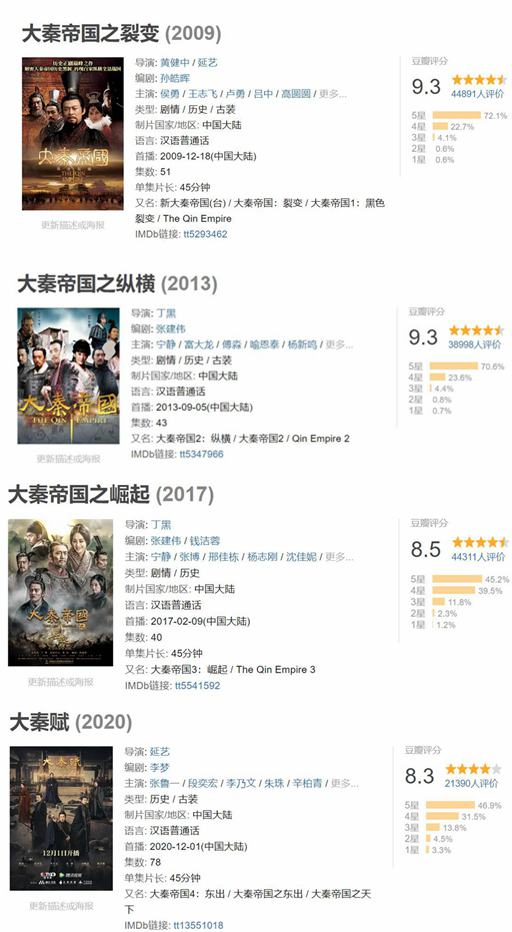 有多神?看豆瓣评分就知道了,《大秦帝国之裂变》9.3分,《大秦帝国之纵横》9.3分,《大秦帝国之崛起》8.5分,《大秦赋》8.3分。