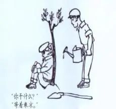 他画了一个戴着帽子的男人,靠在一棵矮而细的小树苗,小树苗都已经被他压弯了,上面几片小树叶好像都要掉了下来,旁边有一位勤劳的男人,他弯着腰拿着小水壶准备要给小树苗浇水,他一脸诧异的目光问靠在树旁的那人说:“你干什么?”那个靠在树旁的男人不屑一顾地回答:“等着乘凉。”