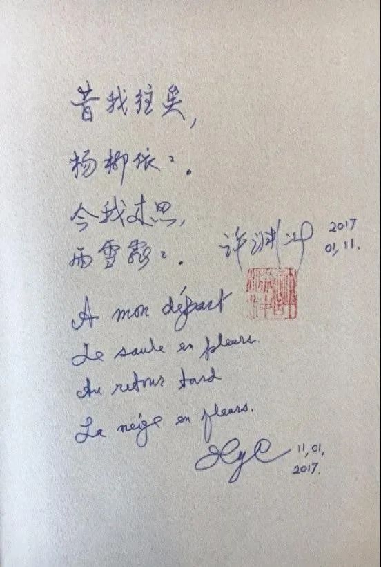 2017年,许渊冲用中文、法文抄写《诗经•采薇》的名句(图片来源:人民日报公众号)