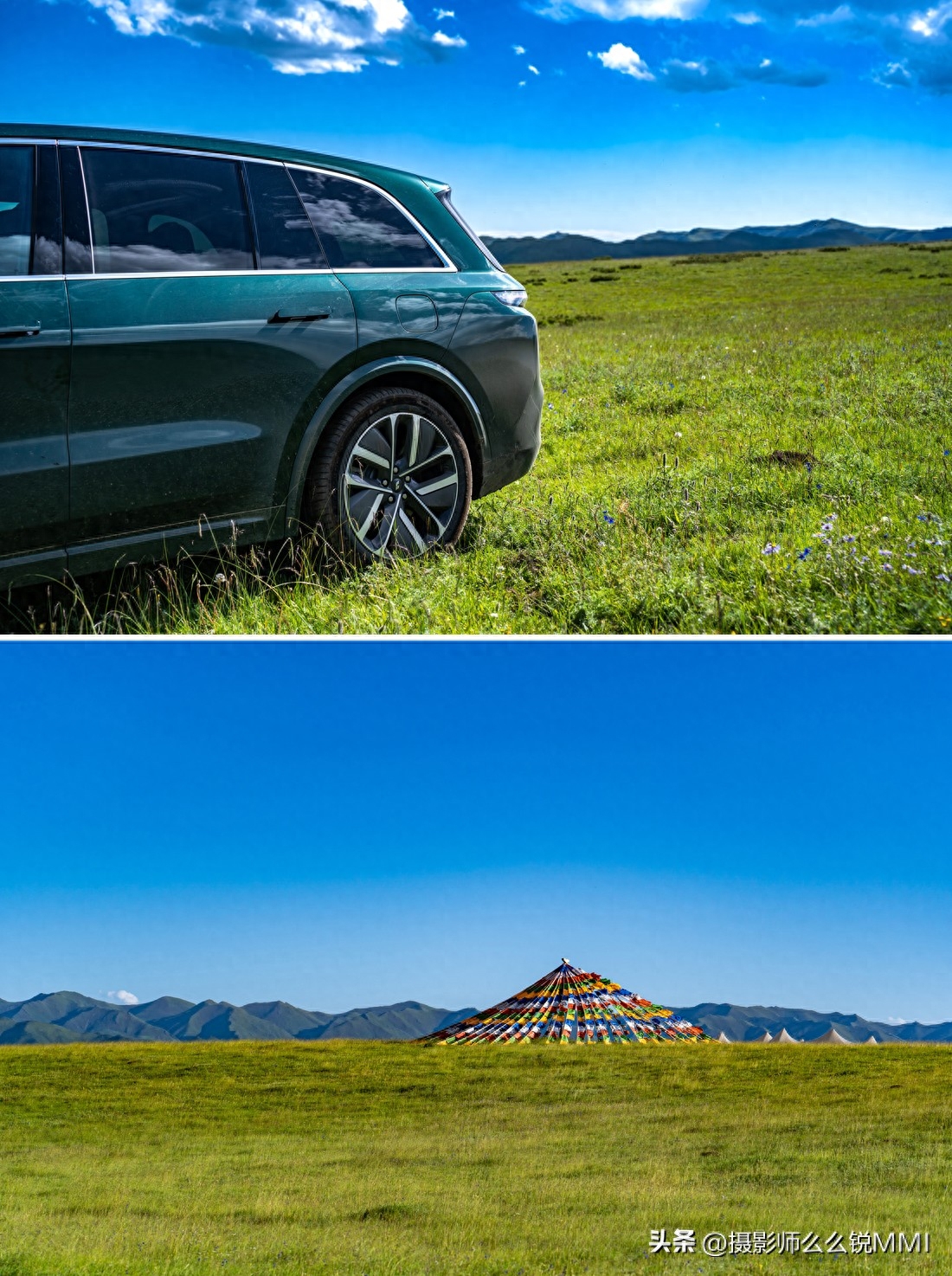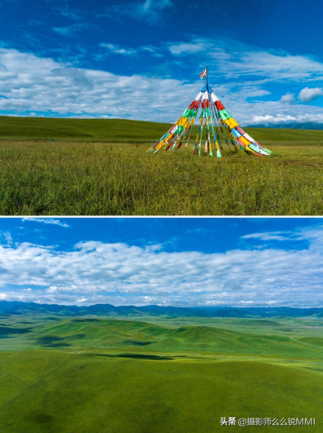 随风起舞的经幡和长达六百多米的经幡隧道无疑是美仁草原上最大的亮点和打卡点,来到这里一定要下车拍照留念哟,仔细观察可以发现,美仁草原的草皮不是那种平坦的一望无际,而是像一个个大馒头一样一包一包的鼓在地面上,远远看去就像是长满了青苔的巨型卵石滩,真是有趣哈,这里向四下望去,只有远远的地方才有高高的山峰,眼前就都是这可爱的“卵石”草原,头顶就是一整片的天空,真想先不走了,找个星空小屋住下来,晚上,等银河升起,看不尽那浩瀚的星海!