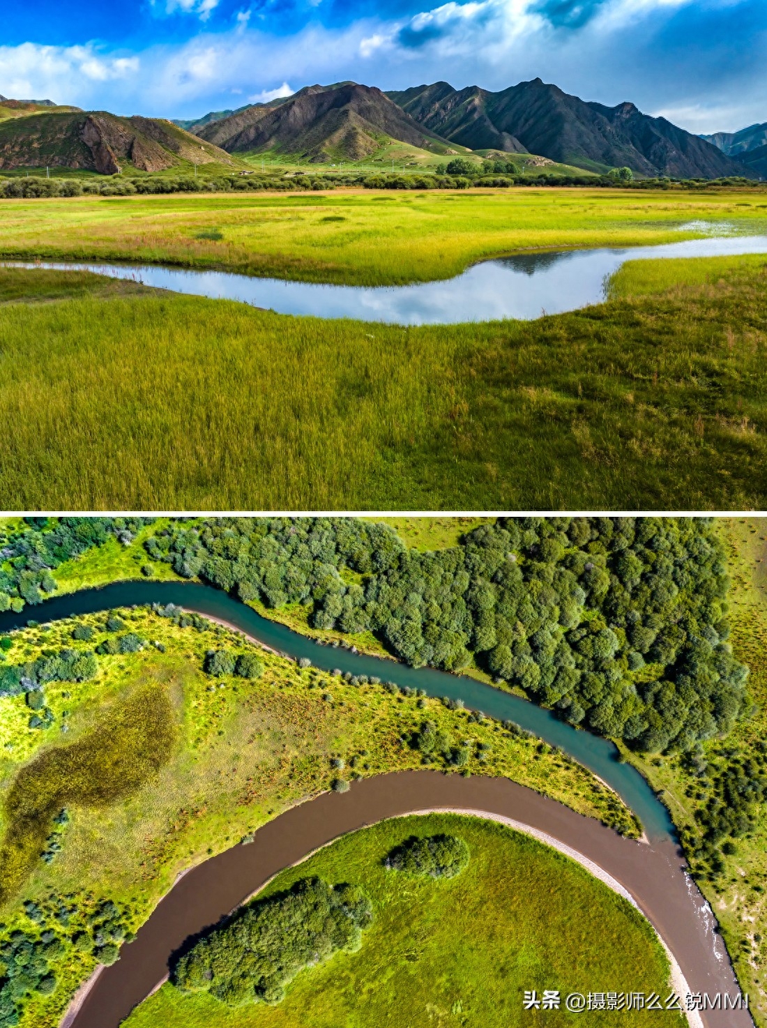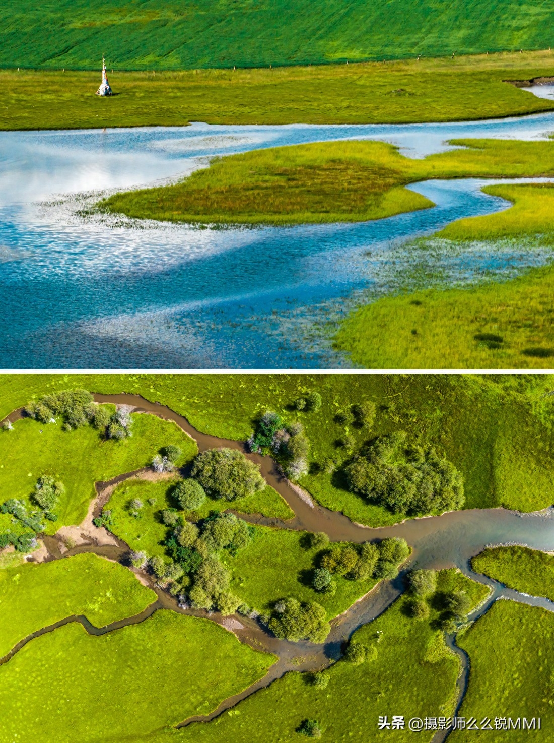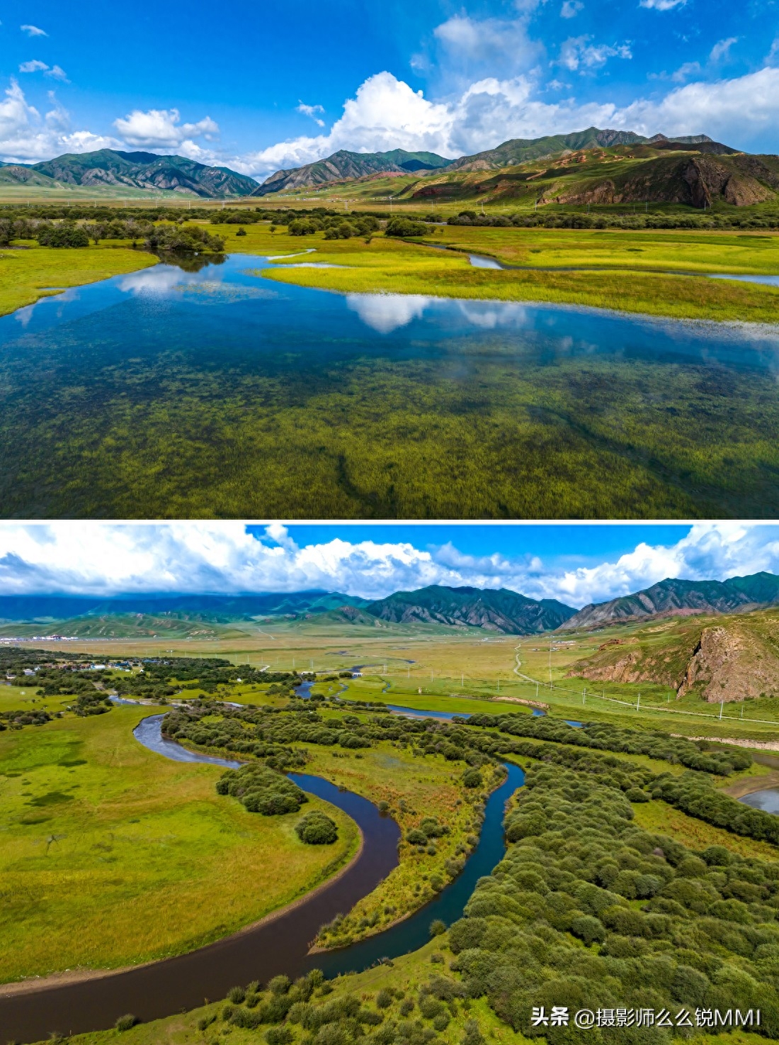 还有最不能错过的桑科草原湿地,拍照打卡也非常出片,蜿蜒的河流淌过平坦的草原,遇到一丁点坡度或是硬地就会改变方向,形成了各种九曲十八弯的草原湿地水系,空中看去,一棵棵生命之树也在用流淌着丰富矿物质的河水,滋养着这片广袤大地。