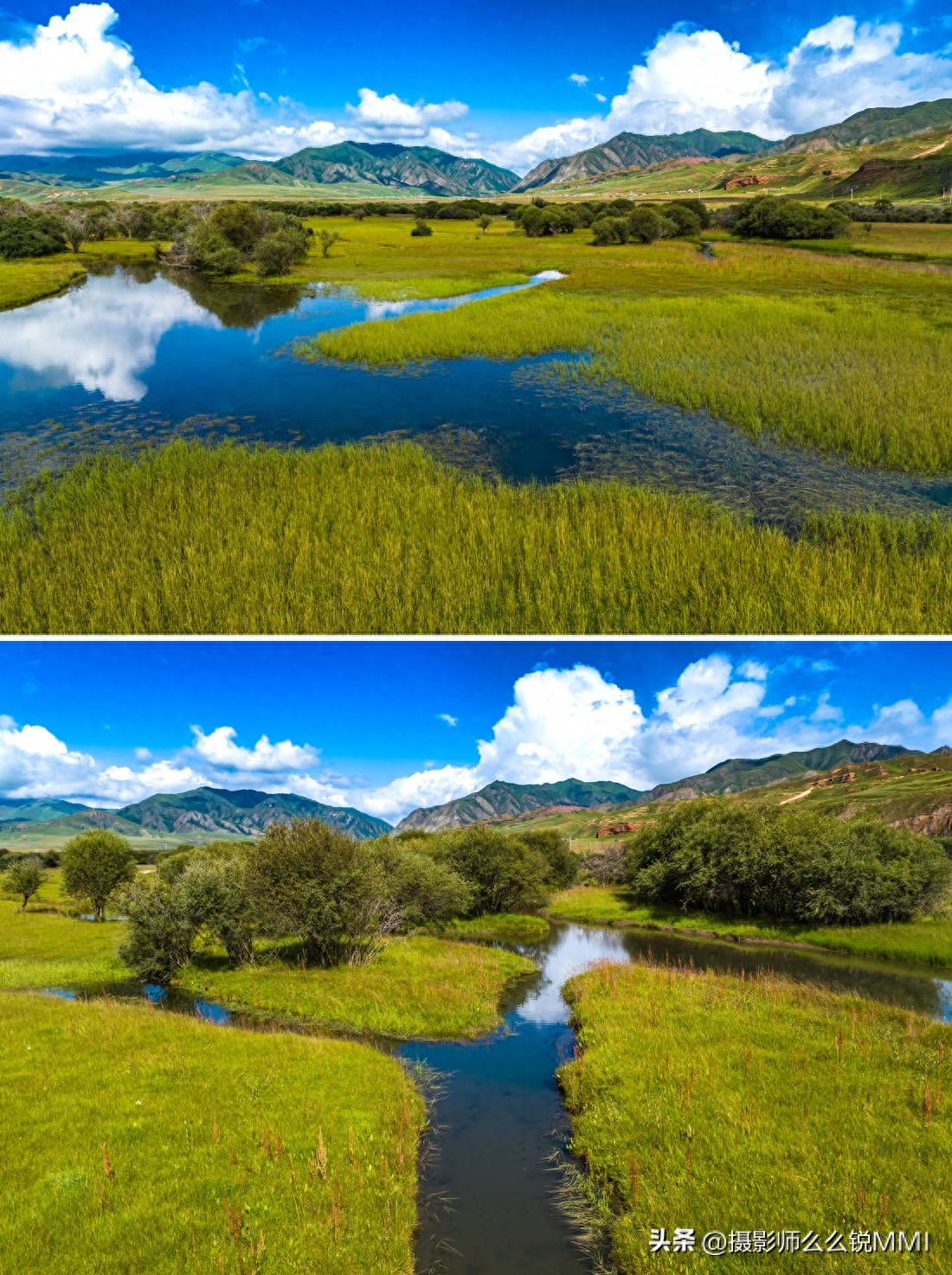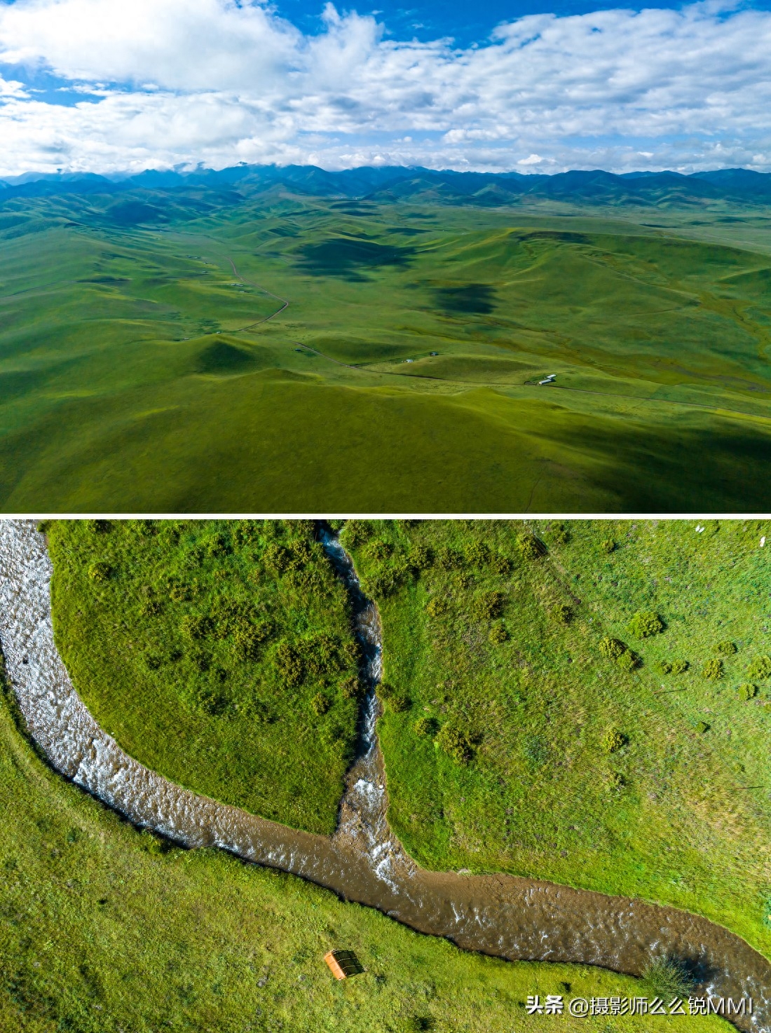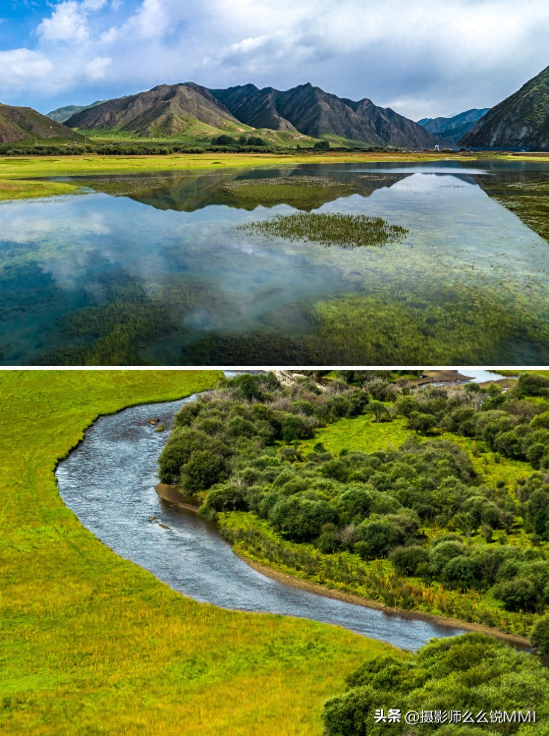 还有最不能错过的桑科草原湿地,拍照打卡也非常出片,蜿蜒的河流淌过平坦的草原,遇到一丁点坡度或是硬地就会改变方向,形成了各种九曲十八弯的草原湿地水系,空中看去,一棵棵生命之树也在用流淌着丰富矿物质的河水,滋养着这片广袤大地。