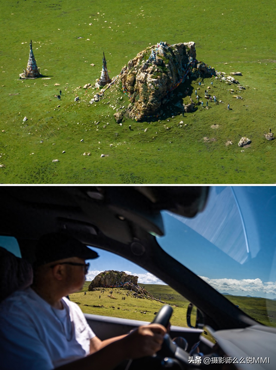 开着开着,路边突然出现一座裸露的奇石山峰,就孤零零的从平整的草原里长了出来,近看都是碎石堆砌般的罗列向上,有点像一座神圣的青灰色庙宇,因为位于垭口附近,是一出很明显的地标式存在,所以当地人也就将它奉为神迹的供侍起来,用经幡将它团团围住,祈福路过的人们好运。