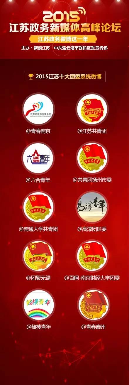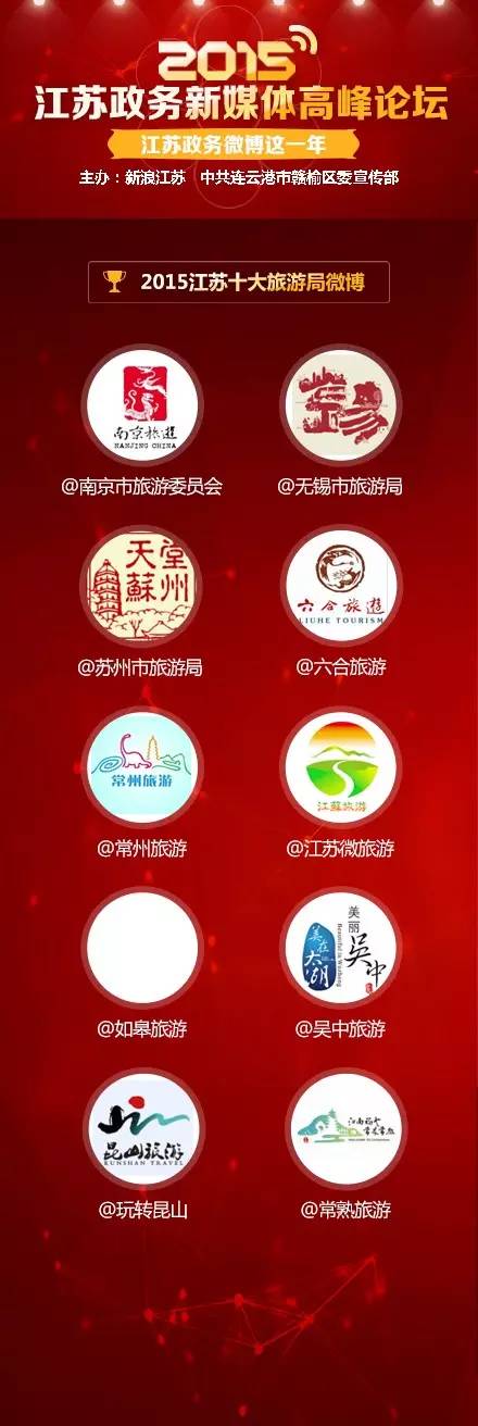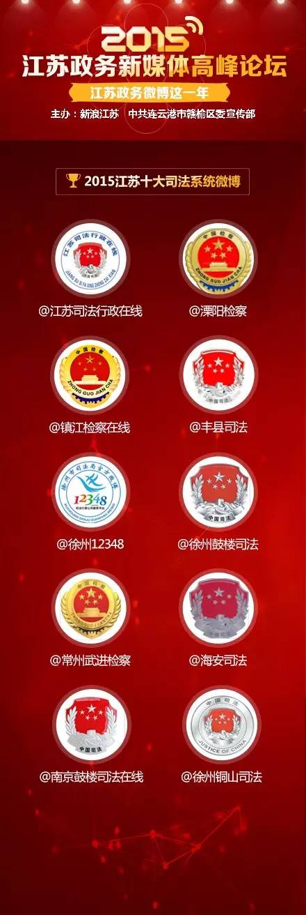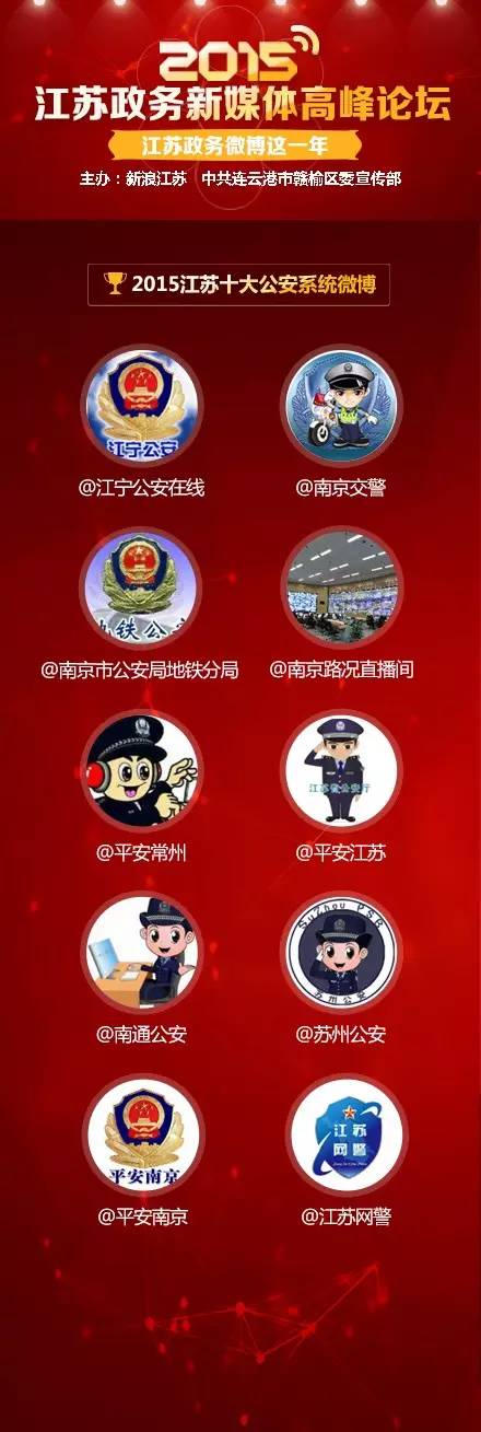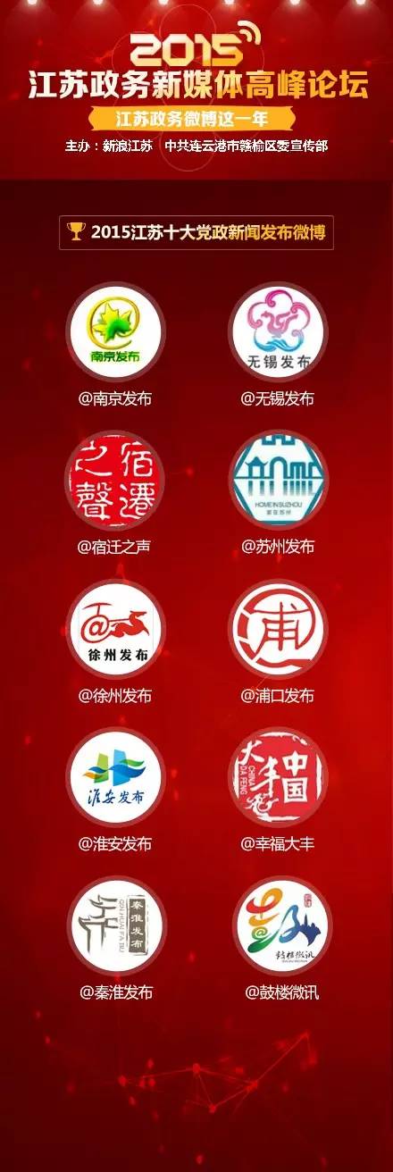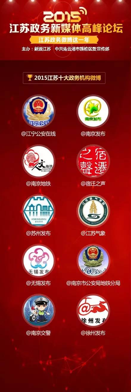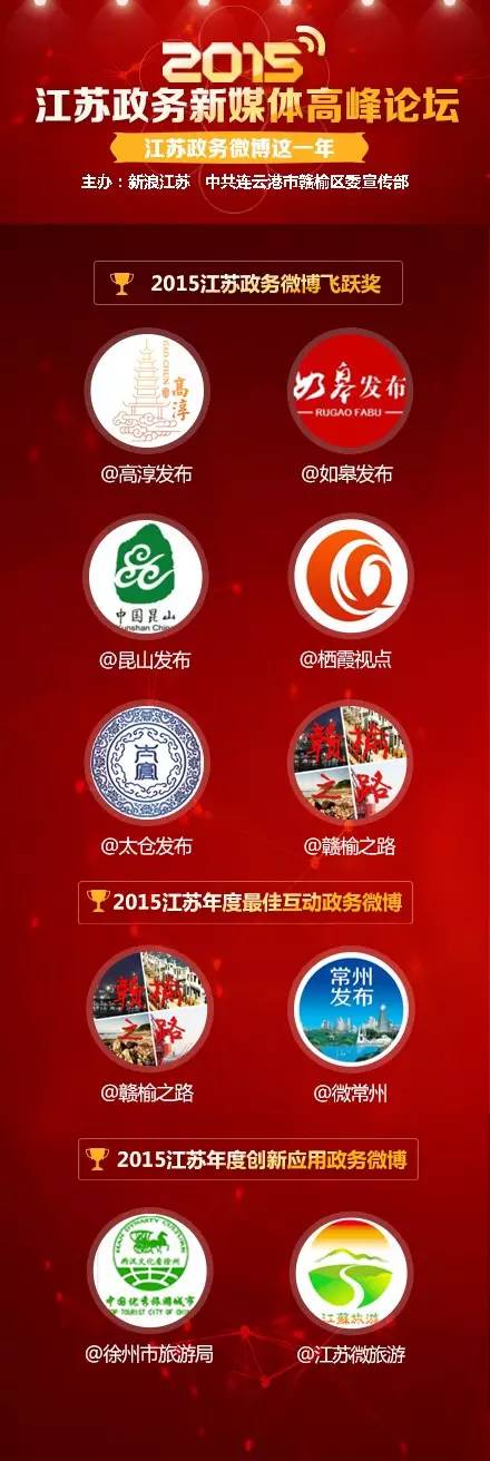 由新浪江苏、中共连云港市赣榆区委宣传部主办的2015年江苏政务新媒体高峰论坛于1月25日在连云港赣榆举行,@南京发布、@江宁公安在线等江苏重要政务新媒体代表齐聚一堂,探讨政务新媒体成功案例及新媒体的管理和运营的策略。2015年江苏政务指数微博影响力榜单也在此次大会上发布。