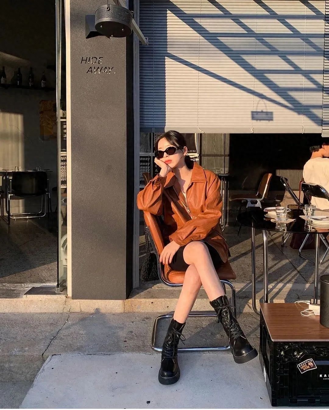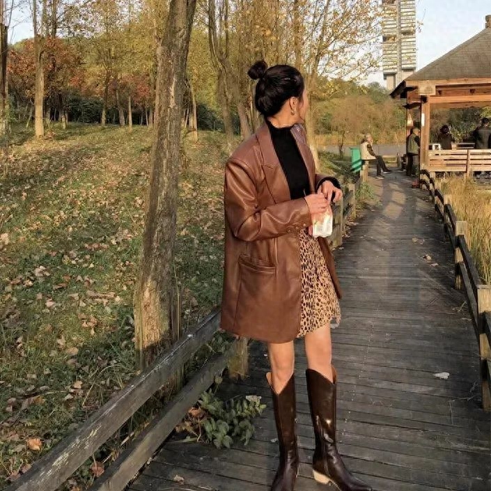 嫌不够酷的姐妹可以试试西装外套,它两组合在一起就是最酷的cp,深棕色的靴子+浅棕色的外套,和同样棕色系的豹纹短裙,很适合秋冬的一套Look!