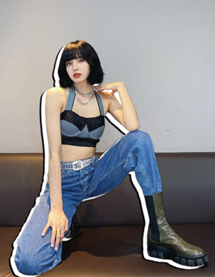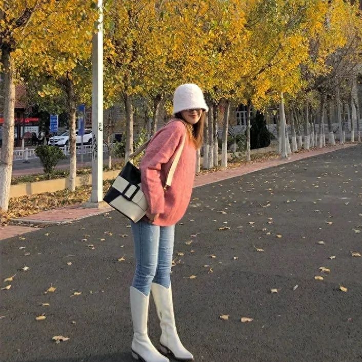 当然啦搭配裤子同样很可,紧身牛仔裤外穿白色骑士靴,增加了穿搭的层次感,搭配同样白色的包包和渔夫帽,颜色上下呼应,整体很和谐。