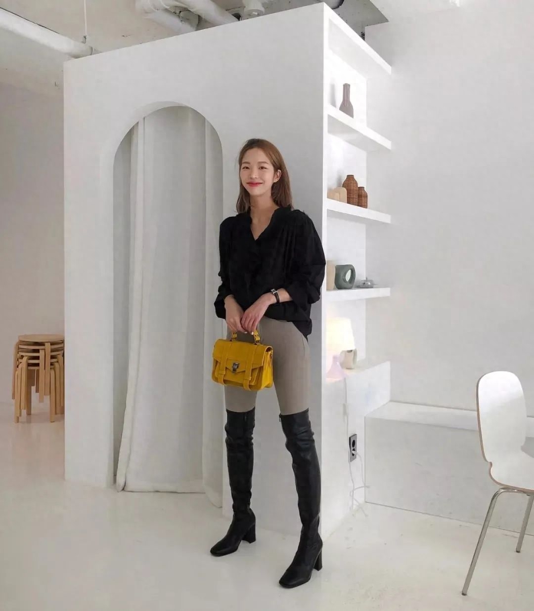 过膝靴虽然显腿长,但可不是越长约好哦!一般来说,长度在膝盖以上3~10cm,是最安全不易出错的。