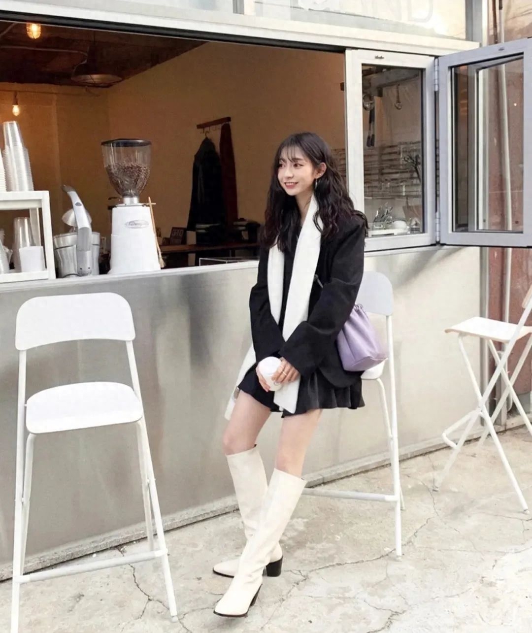 除了最常规的黑色烟筒靴,白色的烟筒靴更亮眼独特一些冬天穿什么鞋,和浅色的衣服也更搭哦!
