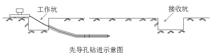 利用用比钻杆外径略大的箭咀式小钻头打导向孔,钻杆从地面钻入,地面仪器接受由地下钻头内传送器发出的消息,控制钻头的方向和深度,钻成准确的定位导向孔。再利用导向孔,反向回扩,回扩时只将设计孔径内的原状土搅碎。最后利用清孔设备清出孔道内泥土,形成安管的通道。在钻进先导孔和扩孔时注水润滑钻具,扩孔搅碎孔内原状土时,要将孔内土搅拌形成塑性泥浆,在清孔时借助于机具的挤压,在孔壁上形成光滑的一层护壁泥皮,用以平衡孔道内的固岩压力,最终造成稳定光滑的安管通道。孔道成型后利用拉力机将管节拖拽入孔道内,完成安装工作。