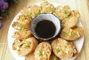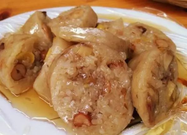 选用猪肠中段,将糯米与猪五花肉、水发香菇、虾米、莲子和调料搅拌后灌入猪场中蒸制而成。