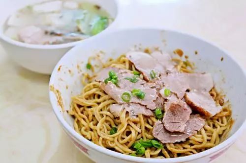 一碗干面搅拌特质的酱料,上面铺上一些肉片,搭配一碗肉丸酸菜汤,很是开胃。大片的猪肉,汕头人叫做“朥”,也叫吊龙肉,就是提前卤好的猪肉。