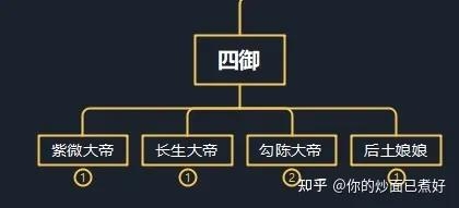 玉皇大帝之下有四御,四御即是南极长生大帝、承天效法后土皇地祇、中天紫微北极大帝、勾陈上宫天皇大帝。