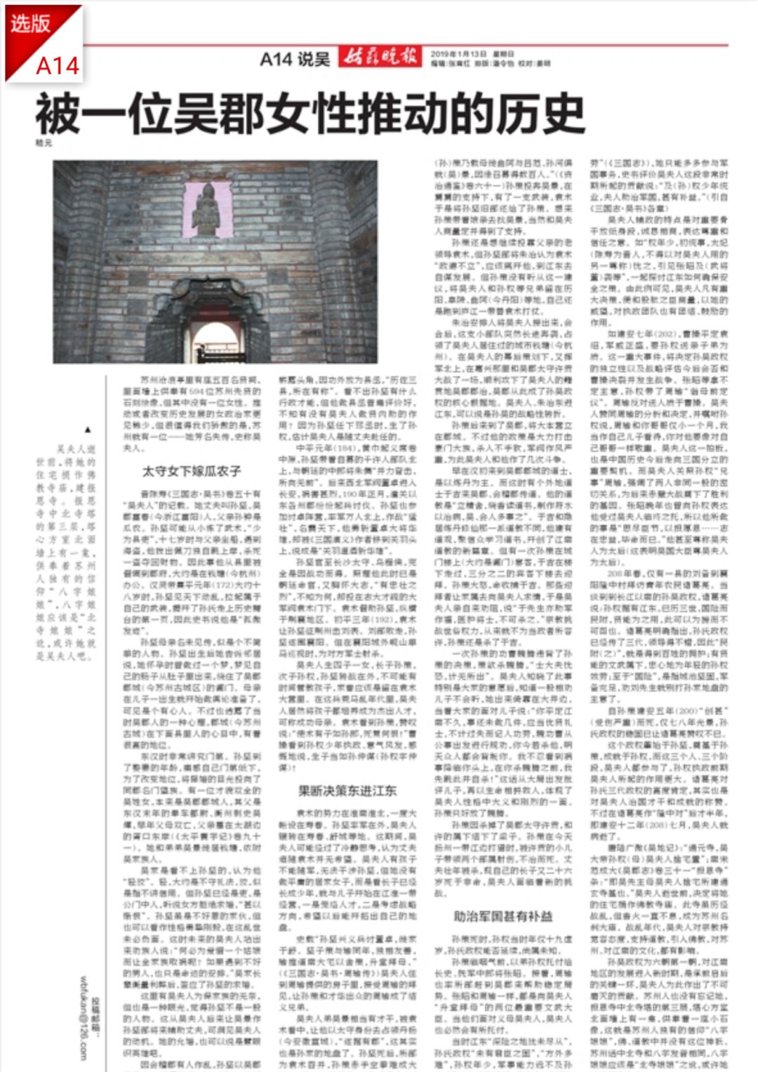 孙吴政权为六朝第一朝,对江南地区的发展进入新时期,是承前启后的关键一环,吴夫人为此作出了不可磨灭的贡献。苏州人也没有忘记她,报恩寺中北寺塔的第三层,塔心方室北面墙上有一龛,供奉着一座小石像,这就是苏州人独有的信仰“八字娘娘”,佛、道教中并没有这位神祇。苏州话中北寺和八字发音相同,八字娘娘应该是“北寺娘娘”之讹,或许她就是吴夫人吧。